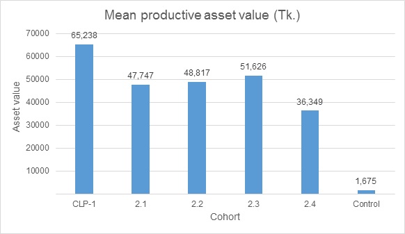 To monitor outcomes of the programme, the CLP collects data using a rolling baseline or pipeline control approach. This is where the baseline status of new, annual entrants, provides the basis against which one can measure the progress of earlier cohorts. This figure shows the mean value of productive assets for Cohort 2.1 between joining the CLP (2010) and 2013. This shows that the impact CLP has on mean productive asset values is sustainable.