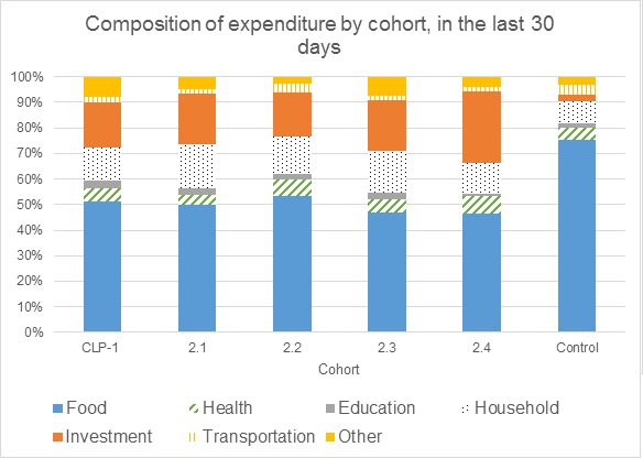 The largest proportion of household expenditure goes on food and this is consistent across all cohorts. In the last 30 days, 75.4% of the control group’s household expenditure was spent on food. For Cohort 2.4 households that are still part of CLP, this decreases substantially to 46.5% and continues to remain around this level as participants complete the Programme (Cohort 2.3). For cohorts that have left the Programme, data seems to fluctuate very slightly but stays around the 50% mark.