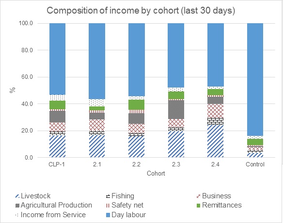Above figure shows the breakdown of the types of income source for households by cohort. There is a clear trend away from day labour, which constitutes the majority of income for the control group (83.7%), towards other forms of income. Day labour is replaced largely by income from the sale of livestock and livestock products, such as milk and manure, and secondly by agricultural production. This is important as it demonstrates that households are moving away from having one predominant income source to diversified income sources.